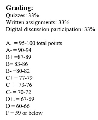 Online discussion 33%: Class powerpoints, readings and videos from a variety of sources will be assigned each week. Each student will post to the class website a question or opinion based on the readings, then respond to the posting of another student. Strong opinions and civility are strongly encouraged. Forum posts will be evaluated based on relevance and quality of post, as well as contribution to the learning community.