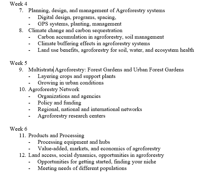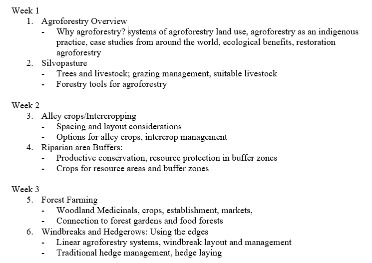 This course serves as a broad overview of agroforestry, and a survey of agroforestry practices, systems, and farm integration. Agroforestry is rooted in indigenous land management and historic farming, where trees and perennial crops are integrated in complex farm systems in numerous pattens. The NRCS defines five agroforestry practices: windbreaks, riparian buffers, silvopasture, alley cropping, and forest farming, but there are myriad gradations and variations.