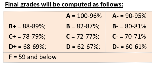 Question formats will include a combination of (1) true/false, (2) written definitions, (3) multiple choice, (4) matching), (5) short answer, and (6) fill in the blank. For the final exam, a list of essay questions will be handed out one week before the exam, and one or two essay questions will be selected from this list.