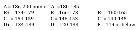 Your grade will be updated frequently and you will accumulate points over the semester as you complete your assignments. Points will be awarded for completion of activities outlined below. 200 points is the maximum points to be earned.
