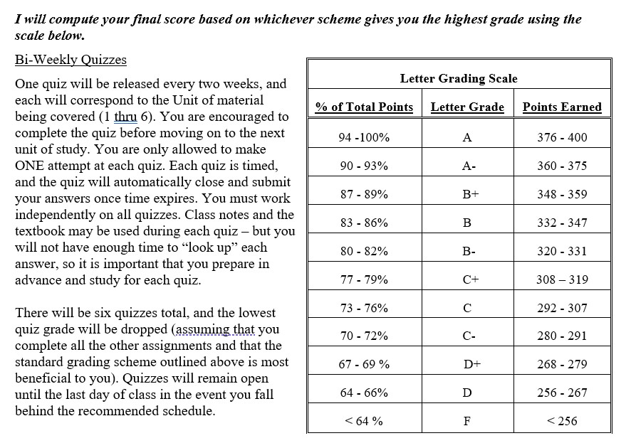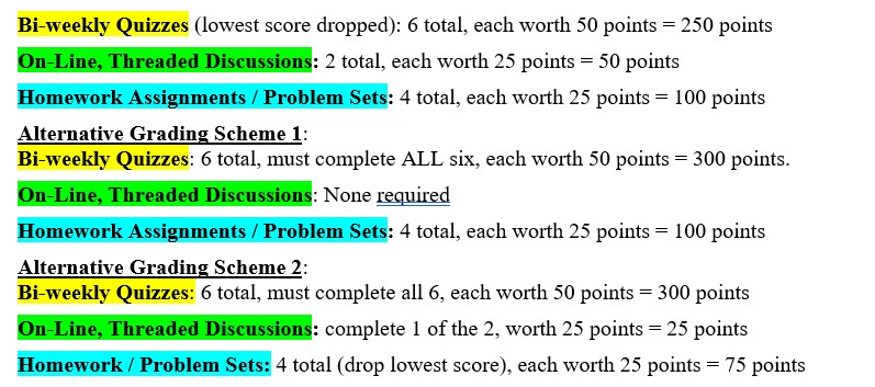 The course includes objective quizzes, homework assignments, and asynchronous threaded discussions; however, you get to decide (to a certain extent) how much each of these components is weighted in your final grade, which is based on 400 possible points.