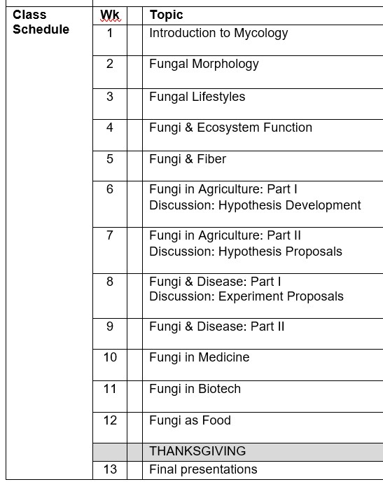 Course Description: Biology, ecology, physiology, and taxonomy of fungi. Includes consideration of fungi as sources of food, medicine, and fiber, as well as causes of diseases in animals, humans, and plants, and their uses in agriculture and biotechnology applications.